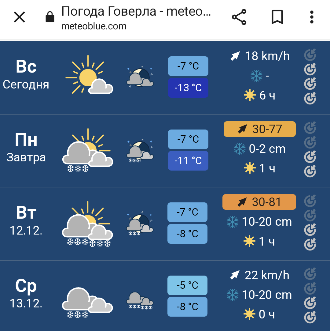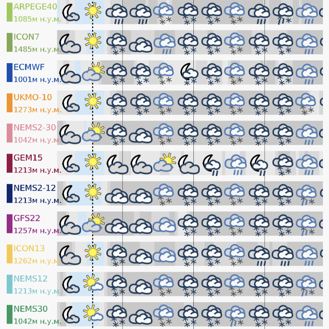 Якщо можливо, проаналізуй погодинну картину погоди. Ти можеш побачити температуру, приблизну ізотерму (висоту замерзання – важливий показник на сходженнях в великих горах) , швидкість і напрям вітру, кількість опадів і, звичайно, коливання температури. Використовуй цю інформацію лише як орієнтир, оскільки погода в горах змінюється швидко і часто без попередження. День, який почався з ідеальних умов, може закінчитися не такими (if you know what we mean)). Щоразу, вирушаючи в гори, потрібно бути готовим до будь-якої погоди. Ми використовуємо ресурс meteoblue.com. Останнім часом він зарекомендував себе як один із найбільш точних. Доречі поточні прогнози на нашому сайті теж підтягуються звідти!