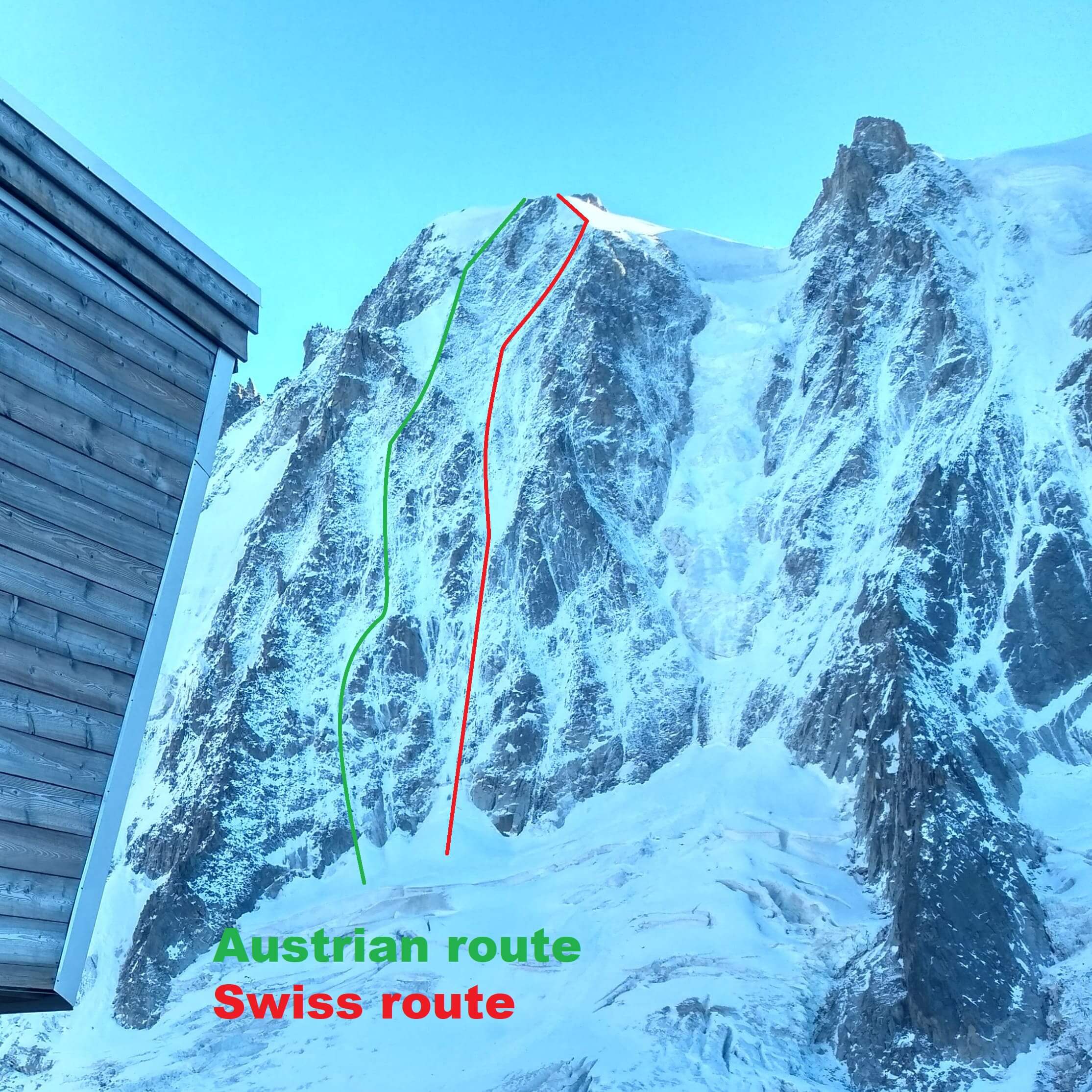 Швейцарський маршрут є трохи складнішим (D+ з максимальним кутом схилу 75 градусів). До того ж в останні роки через кліматичні зміни він поступово перетворюється в комбінований. Тому якщо не хочеш додаткових складностей, то краще обирати сніжні кондиції.