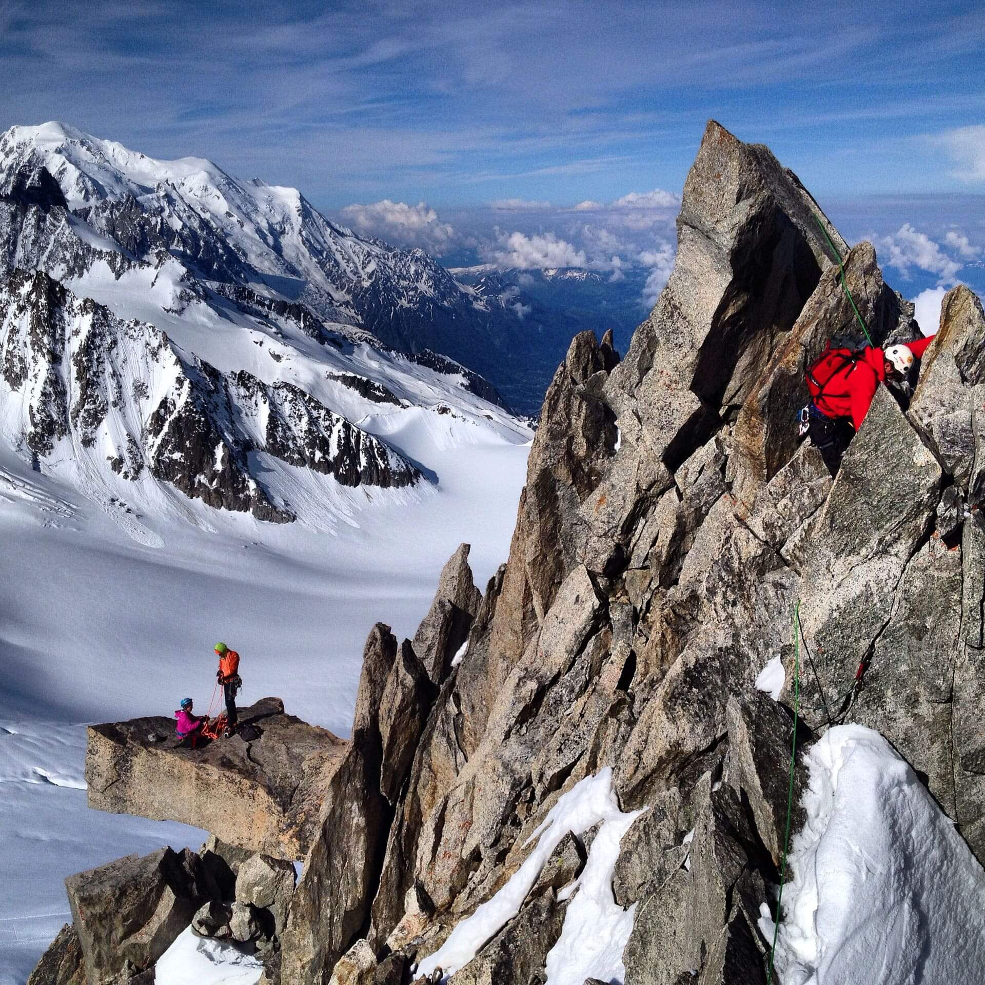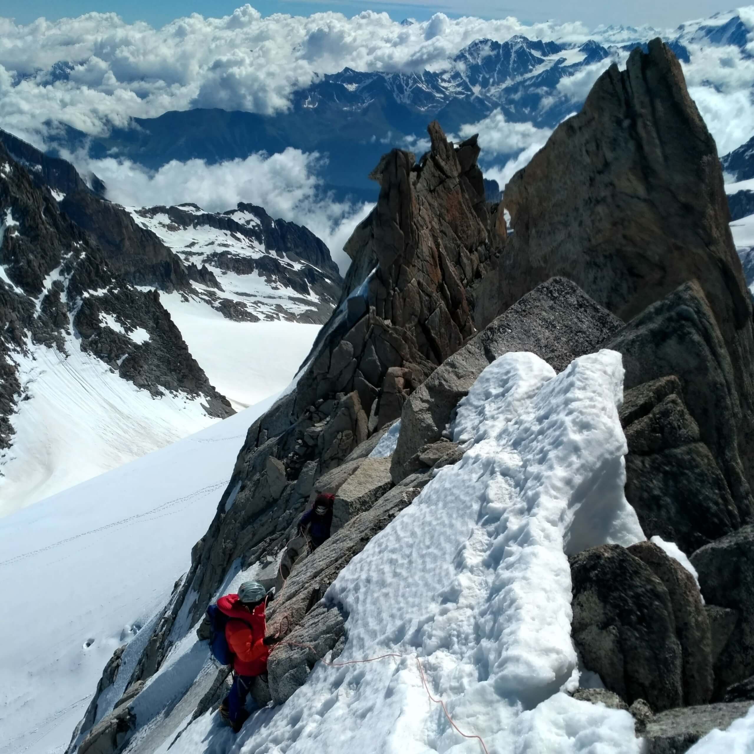 Для любителів полазити по скелях, ну або для любителів інста-фоточок, є декілька коротких суто скельних маршрутів на Aiguille Purtscheller (3478 м). Наприклад класичне південне ребро з приємним лазінням до 5b (про скелелазні категорії тут). Наостанок можеш глянути коротке відео звідти від нашого місцевого друга Ромена!
