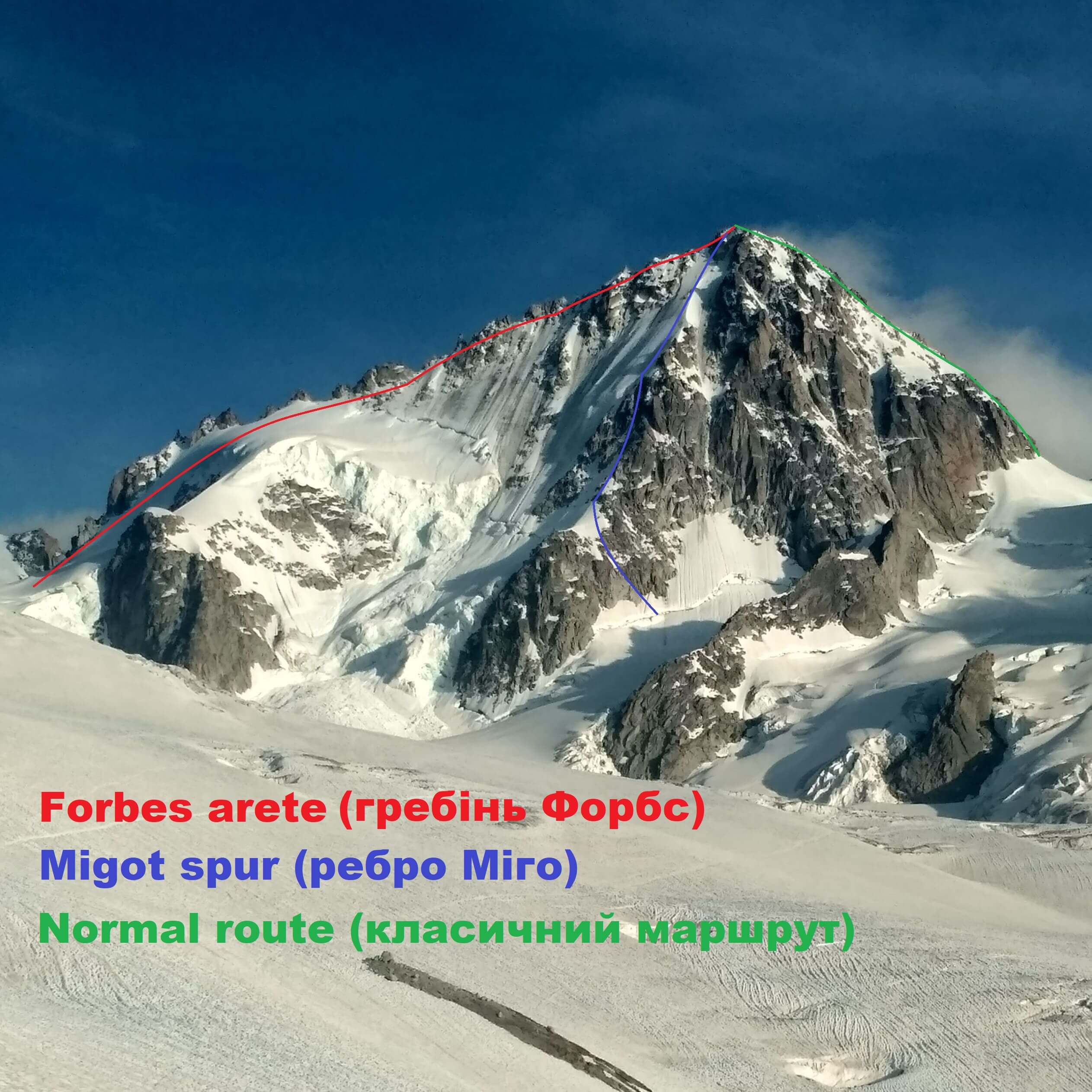 Для самостійних сходжувачів середнього рівня на цій горі є теж супер маршрут, який називається Гребінь Форбс (Forbes Arete). Так, гора звучить як вино, маршрут – як журнал!)) Форбс вважається маршрутом з найкрасивішими видами в Шамоні, а деякі кажуть, навіть в усіх Альпах! Складність AD, супер очевидна лінія і дійсно з дуже крутими краєвидами і гарним рельєфом. Тому всім “трієчникам” (тим, хто самостійно може ходити маршрути нашої 3-ої категорії) або тим, хто хоче сходити просто дуже гарний і красивий маршрут, рекомендуємо!