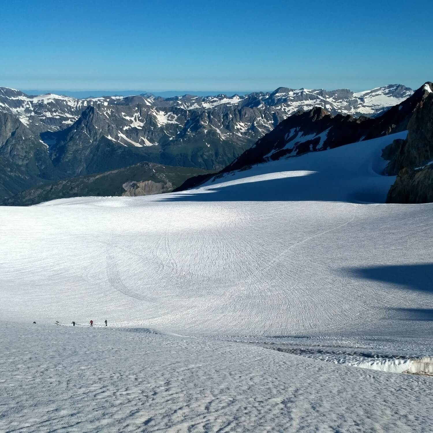 Якщо ж тобі взагалі не хочеться подвигів, то можна зробити сходження на найбільш прості вершинки району на Швейцарському кордоні. Категорії здебільшого F+ або PD. Наприклад Petite Fourche (3520 м) або Tete Blanche (3421 м). Гарна прогулянка через льодовик з класними видами на Chardonnay та плато Trient у Швейцарії гарантовані. Також це класний варіант для акліматизації перед Монбланом, наприклад. Матимеш ночівлю на 2700 і сходження на 3500. Ну або, якщо ти приїхав з компанією друзів, які далекі від сходжень, але хочуть спробувати без психотравм такий маршрут теж згодиться. Таке “сходження” під силу будь-якій здоровій людині. Проте не слід забувати про льодовик. Хоч він і рівний і без тріщин в цій частині, орієнтування на ньому в погану погоду може стати ще тою пригодою, тому май при собі офлайн-мапу.