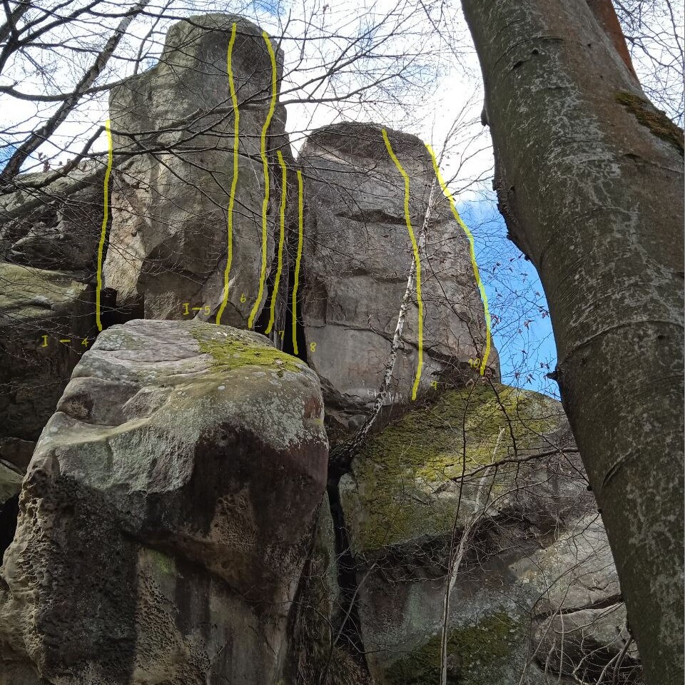 Район складається з трьох скель (масивів): Княжа, Ярославна, Ханська. Якщо підходити до скель, то вони так і розташовані зліва направо. Княжа та Ярославна мають якби по два поверхи. На Княжій фактично можна відпрацьовувати мультипітчі, адже траси першого поверху ти фактично закінчуєш на другому поверсі вже.